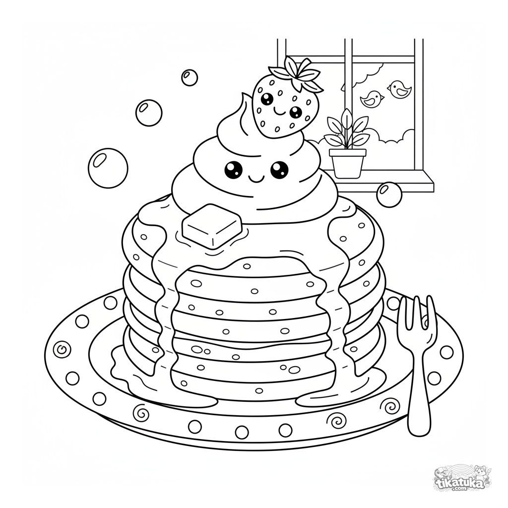 Página para colorear de una torre deliciosa de panqueques. Para niños de 4 a 6 años. Panqueques esponjosos con sirope, nata montada y una fresa sonriente en un plato.