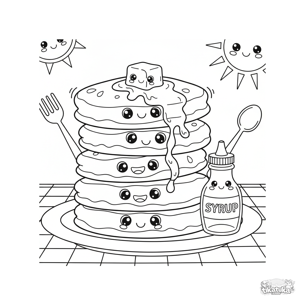 Página para colorear para niños: una torre de panqueques sonrientes con mantequilla derritiéndose. Escena divertida y apetitosa con detalle medio.