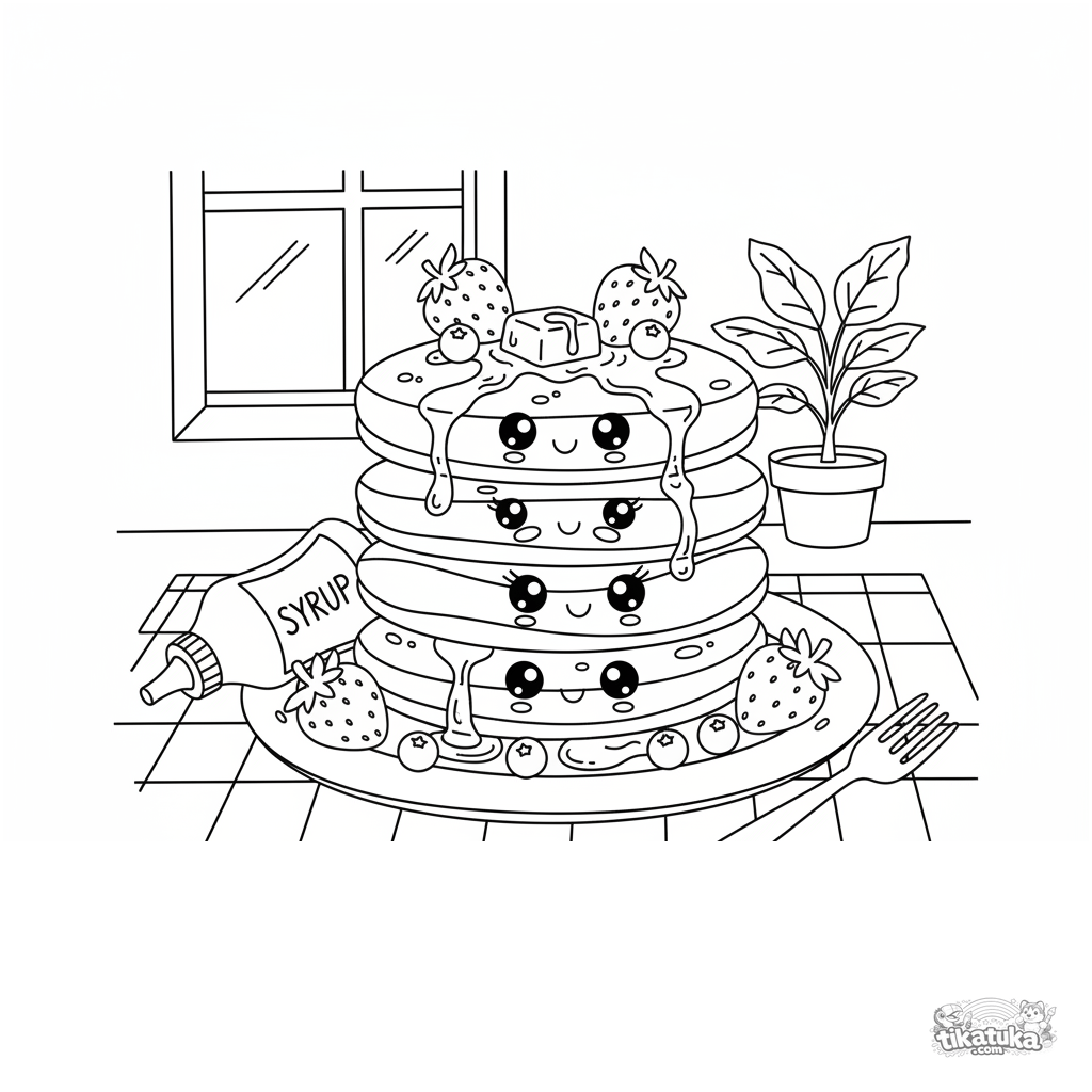 Página para colorear de una torre feliz de panqueques. Para niños de 4 a 6 años. Panqueques sonrientes con bayas y sirope en un plato.