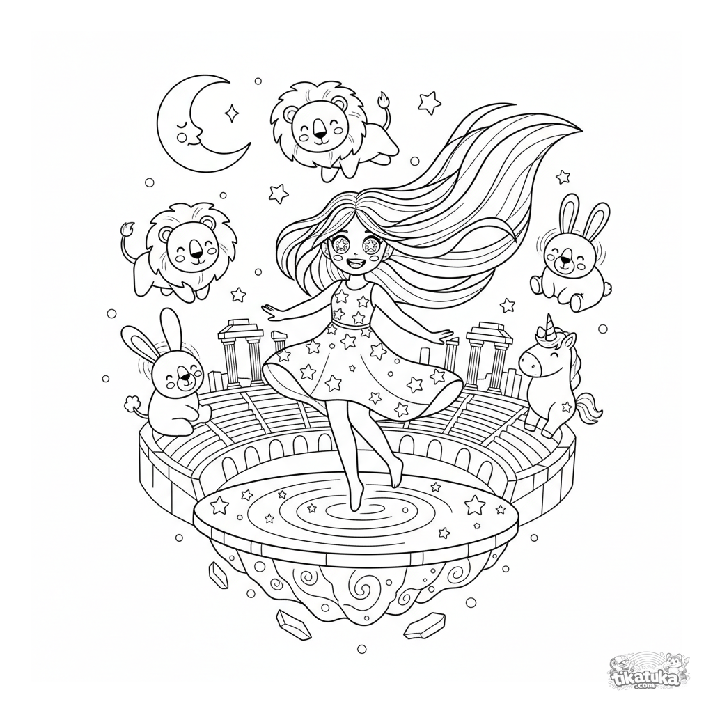 Página para colorear para niños de 5-9 años: una ninfa estelar alegre baila en el cielo nocturno sobre un anfiteatro antiguo. Constelaciones mágicas y formas aéreas.