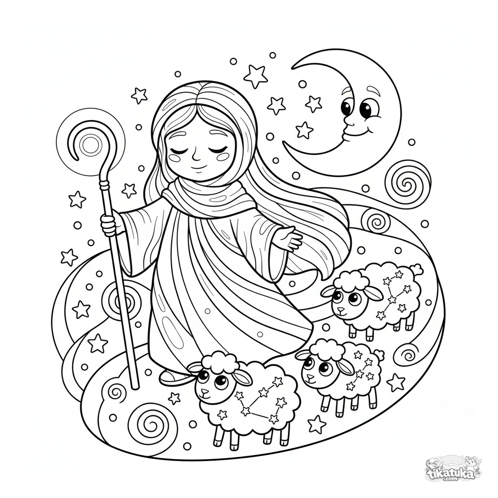 Página para colorear de un pastor estelar guiando ovejas constelación por el cielo nocturno. Para niños de 7-9 años.