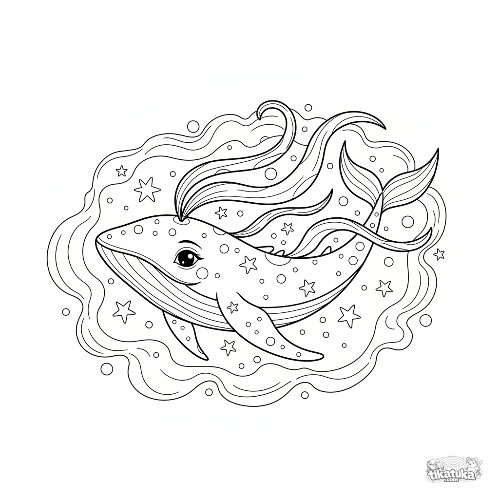 Página para colorear para preadolescentes 7-9: una majestuosa ballena estelar, con un cuerpo con patrones de cielo nocturno, nada a través de una nebulosa cósmica colorida. Escena de fantasía fascinante.