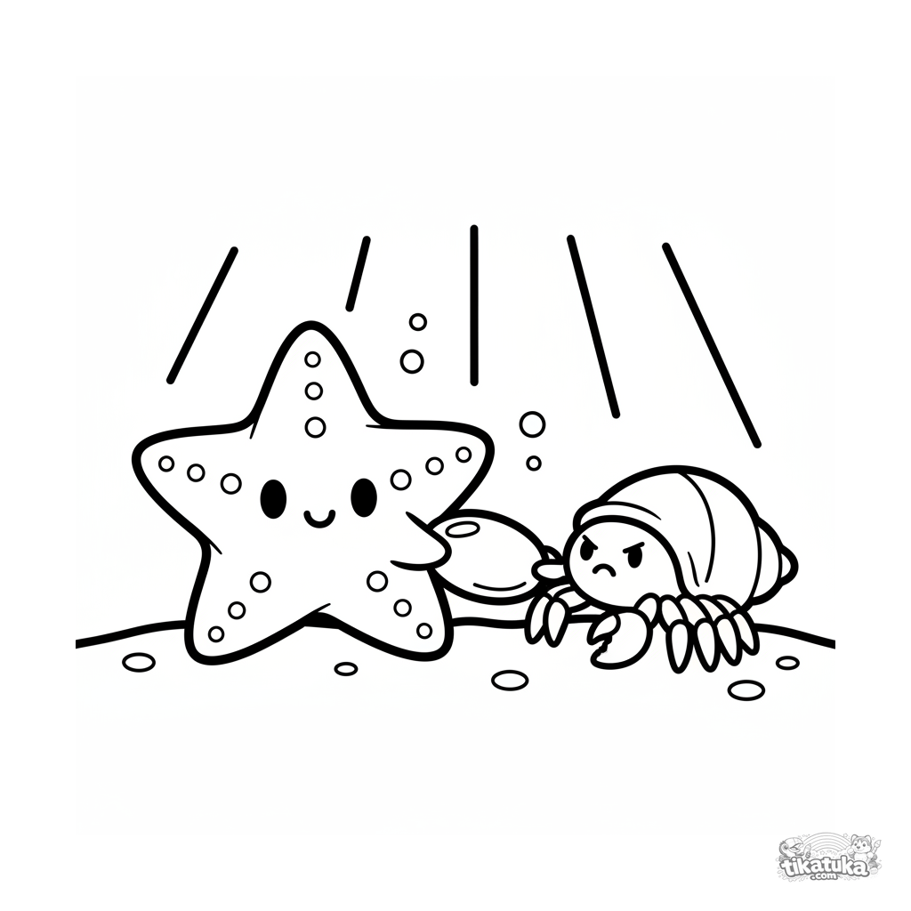 Página para colorear simple para niños pequeños 2-3: una estrella de mar y un cangrejo juegan al tira y afloja en la arena soleada. Formas grandes y suaves.