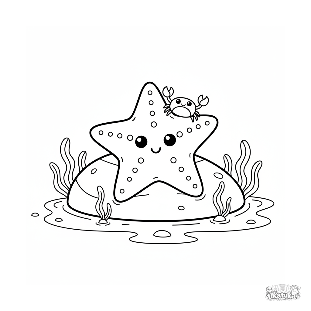 Página muy simple para colorear para niños de 2-3 años: una estrella de mar y un cangrejo en una roca. Figuras enormes, detalles mínimos.