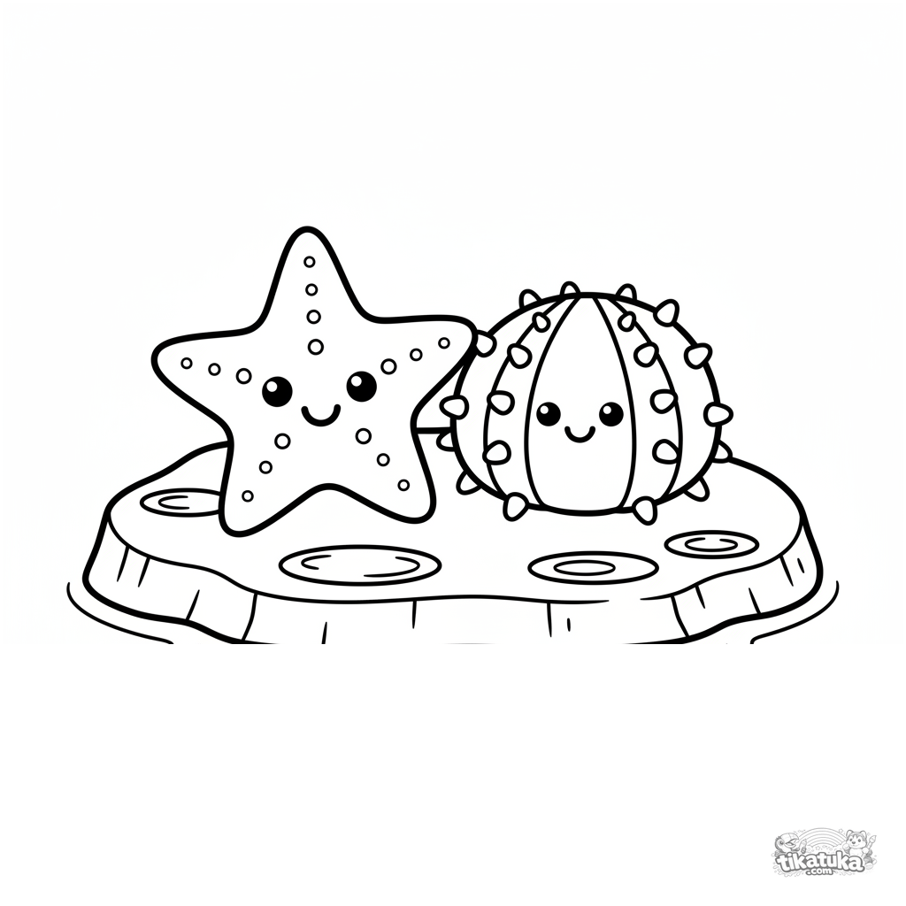 Página simple para colorear para niños pequeños: una estrella de mar y un erizo en una roca en un charco soleado. Para 2-3 años. Formas geométricas como juguetes de madera.