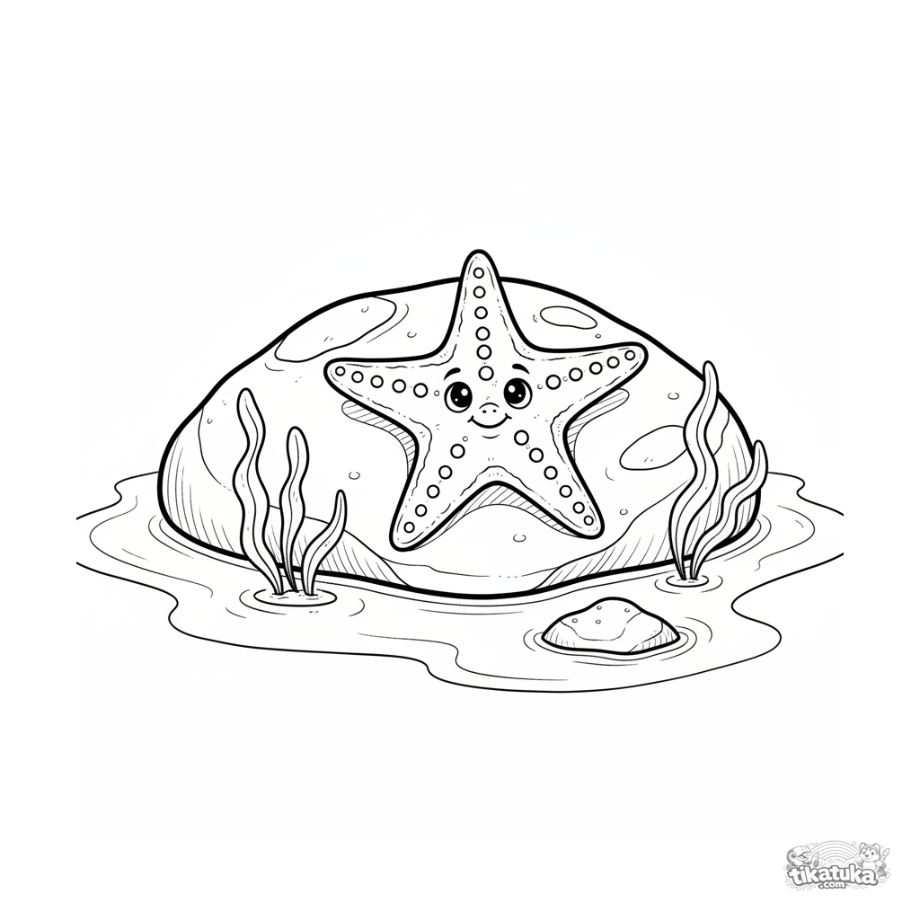 Página para colorear de una estrella de mar descansando en una roca en una soleada charca de marea en aguas poco profundas. Para niños de 7 a 9 años.