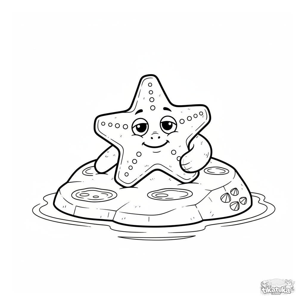 Página para colorear de una estrella de mar acogedora descansando en una roca calentada por el sol en un charco de marea. Para niños de 4-6 años.