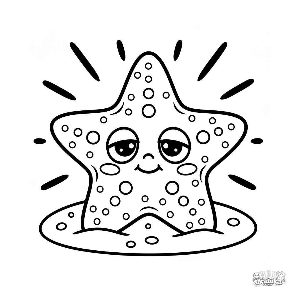 Página para colorear simple y linda de una estrella de mar descansando en arena caliente al sol. Formas muy simples para niños pequeños de 2-3 años.