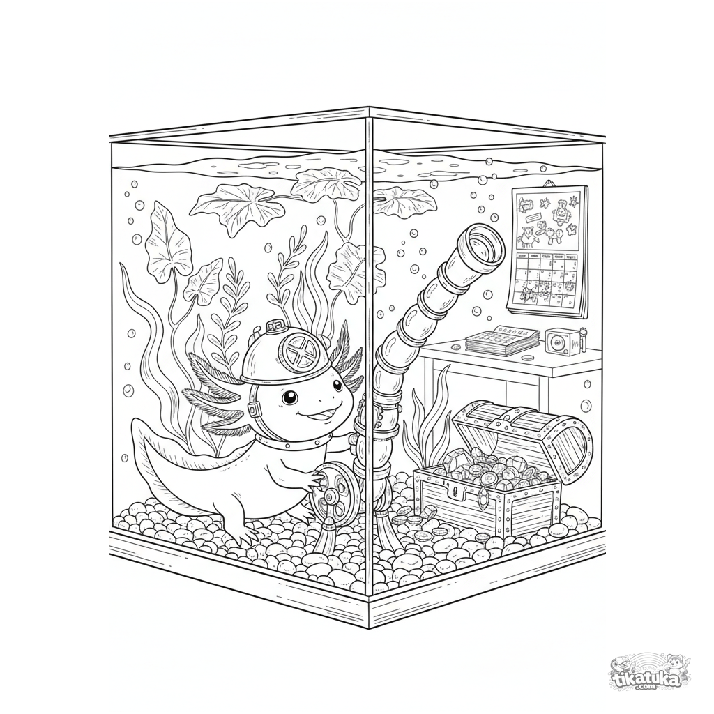 Página para colorear detallada en estilo grabado: un ajolote con casco espía un calendario con un periscopio en una pecera. Meme subacuático complejo y original para niños 10-12.