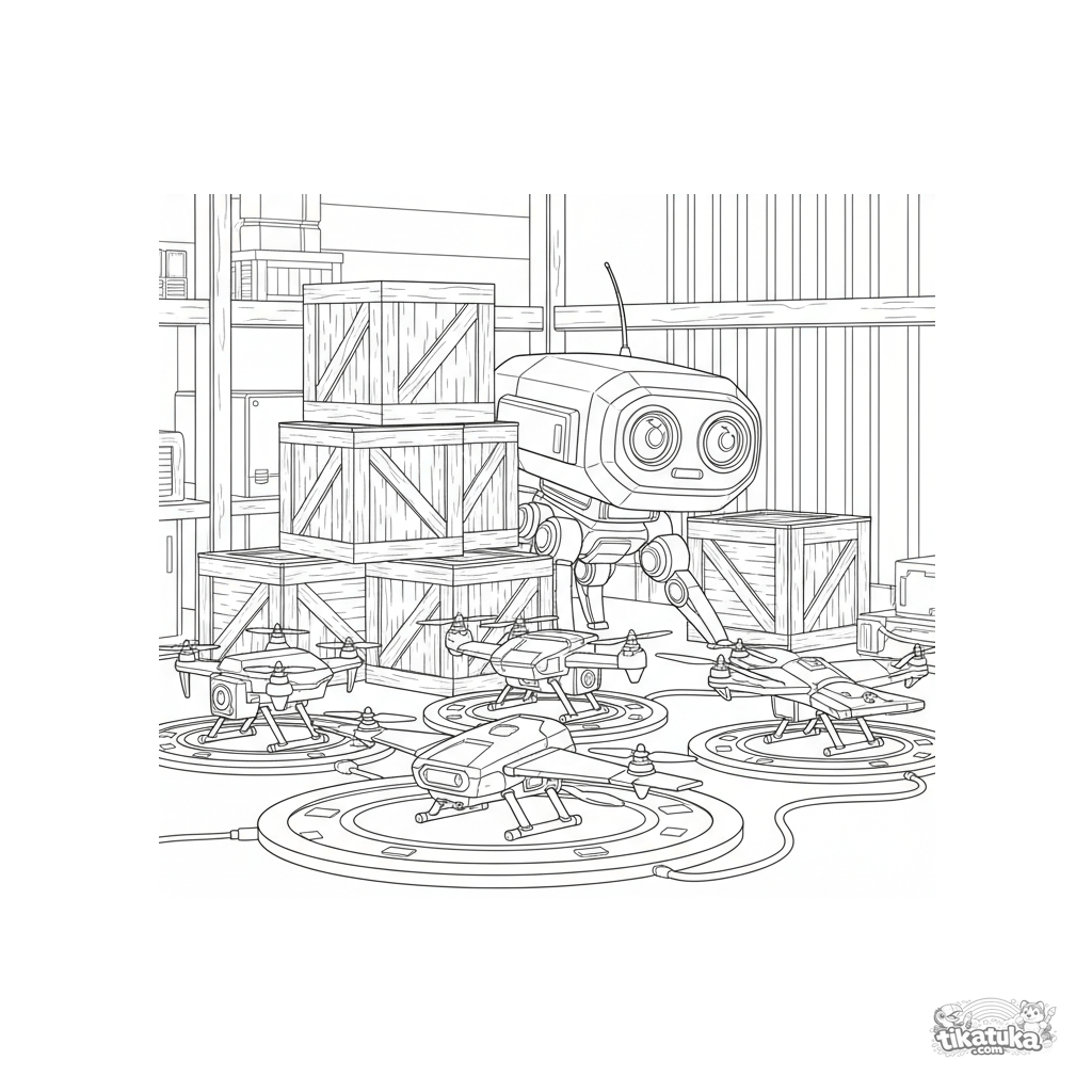 Página para colorear detallada para 10-12 años: un robot de vigilancia sigiloso hexagonal observa drones desde detrás de una pila de cajones de madera en un rincón oscuro del almacén. Cámaras y antenas detalladas.