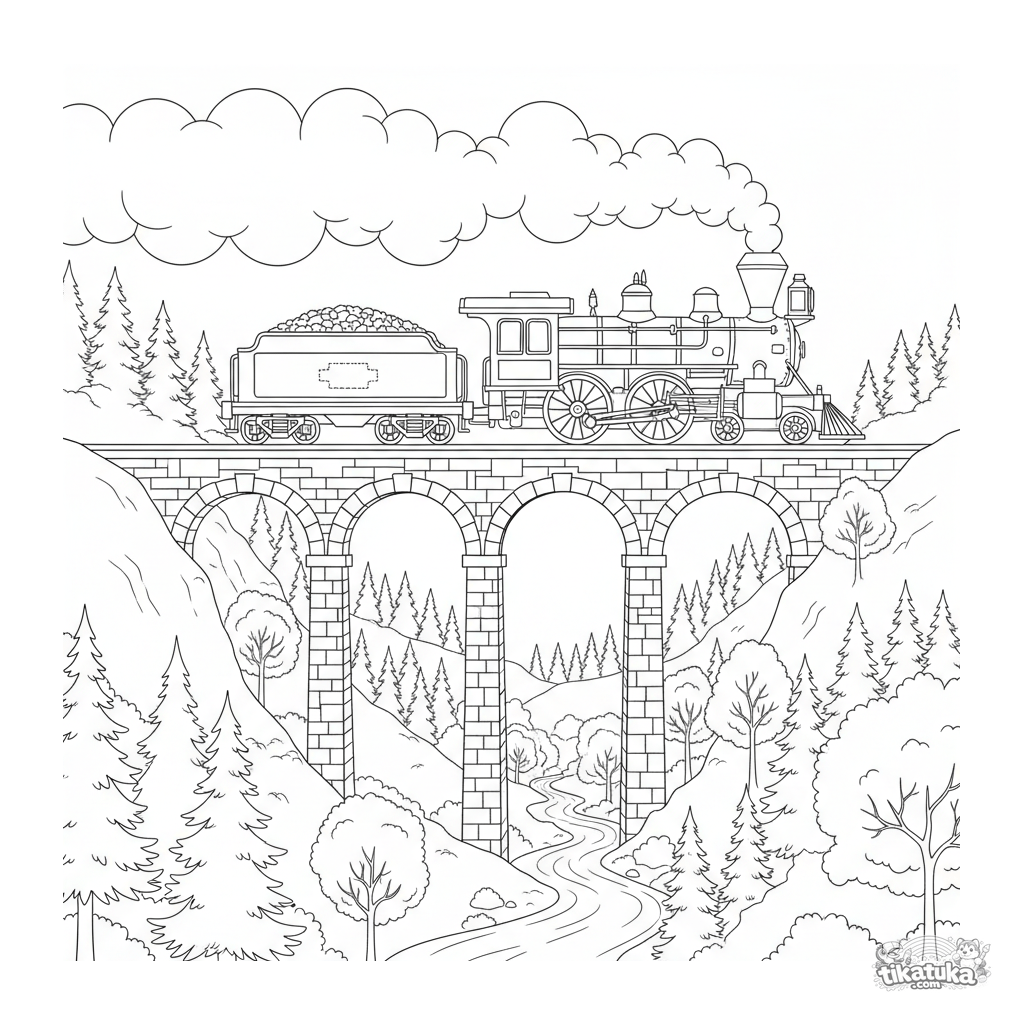 Página detallada para colorear para niños de 7-12 años: una locomotora de vapor antigua con ténder cruza un alto viaducto de piedra sobre un valle profundo. Escena realista.