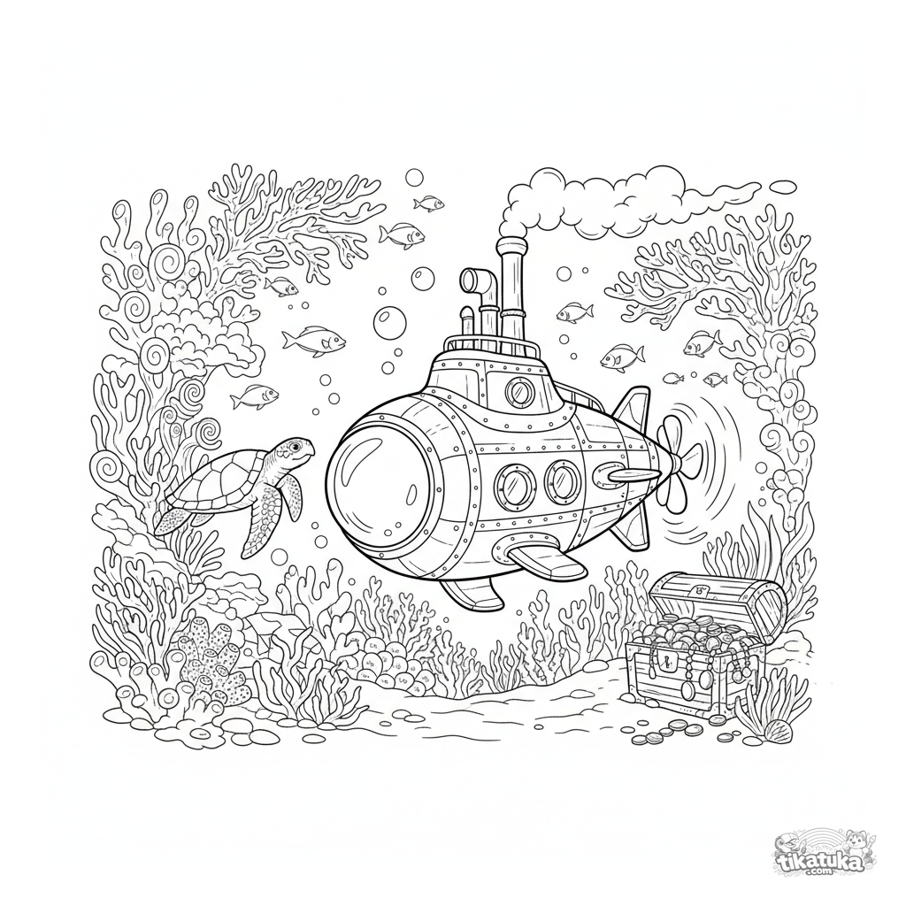 Página para colorear de vehículo difícil: un submarino a vapor detallado explora un arrecife de coral. Para niños de 8 a 12 años. Escena con tortuga marina, coral y cofre.