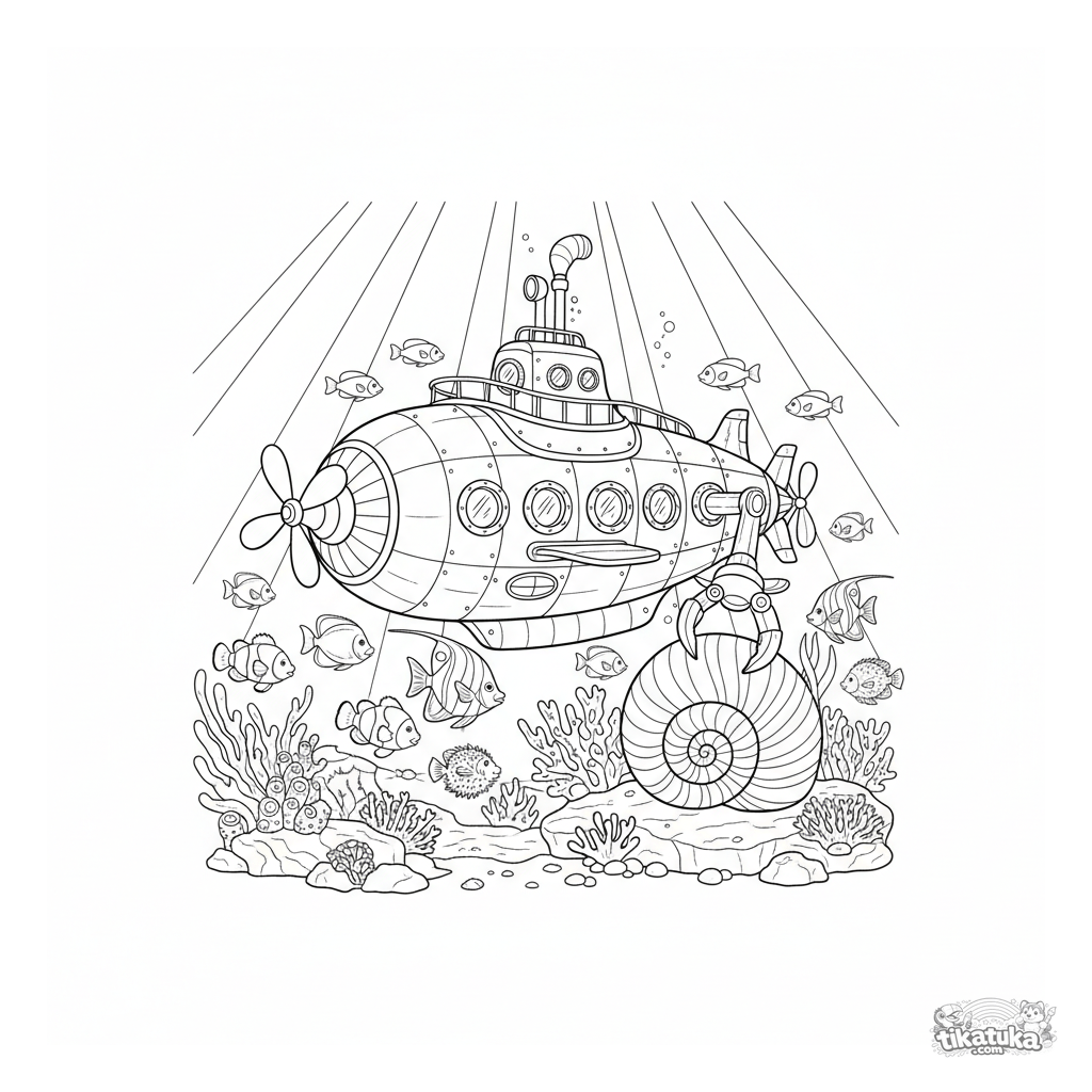 Página para colorear de un submarino a vapor detallado usando un brazo mecánico para explorar un arrecife de coral colorido. Para niños de 8 a 12 años.