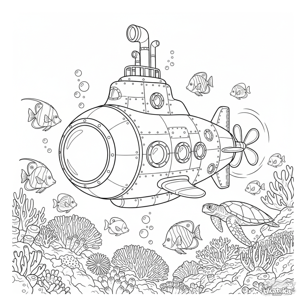 Página para colorear de un submarino a vapor explorando un arrecife. Para niños de 8 a 12 años.