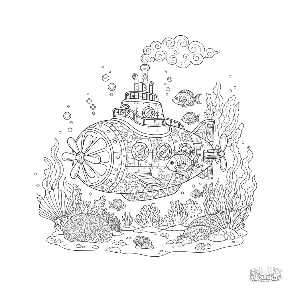 Página para colorear de un submarino victoriano a vapor explorando un arrecife de coral. Para niños de 8 a 12 años.