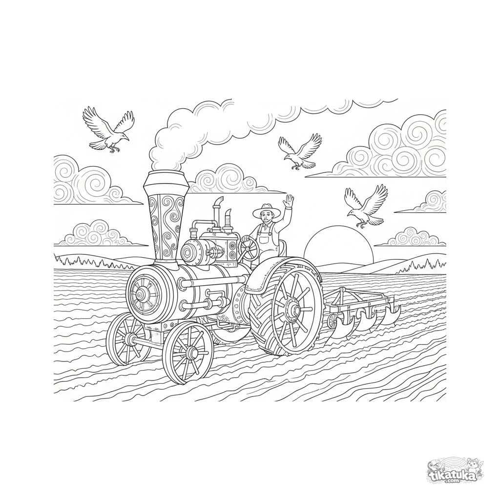 Página para colorear de un tractor a vapor detallado arando un campo contra un cielo al atardecer. Para niños de 8 a 12 años.