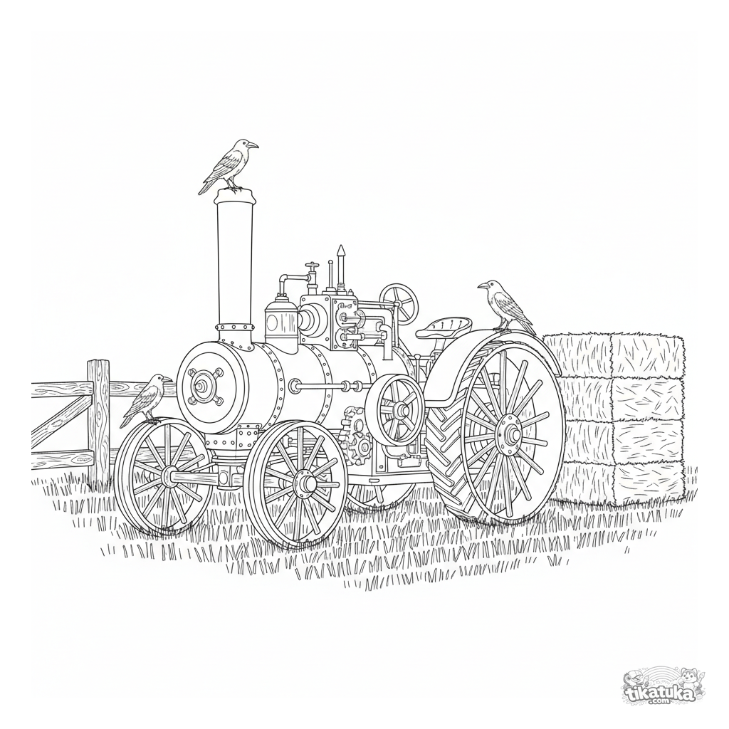Página para colorear difícil de un tractor a vapor detallado en un campo de heno. Para niños de 8 a 12 años. Incluye ruedas de madera, pacas de heno y cuervos. Vehículo completo, márgenes amplios.