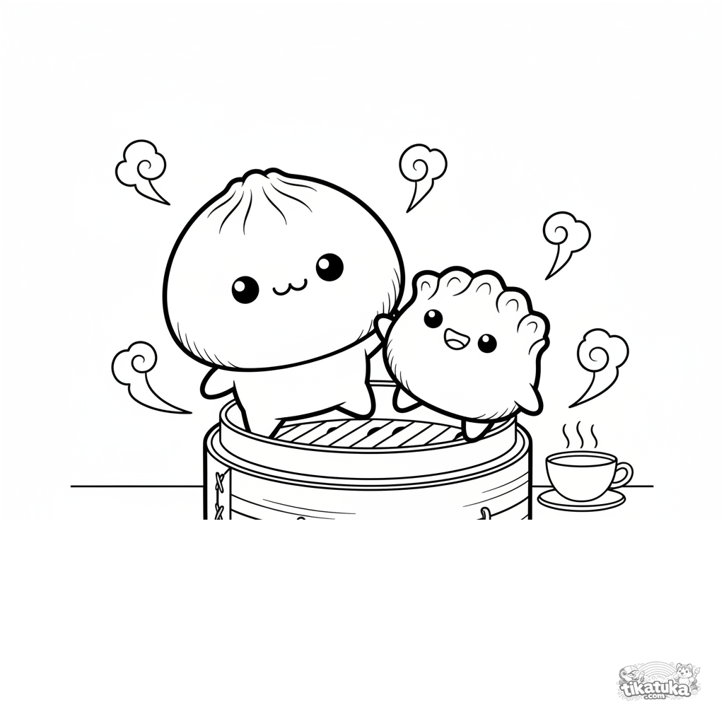 Página para colorear: un bollo al vapor y un dumpling se ayudan a equilibrar en una vaporera de bambú en una cafetería. Escena tierna con vapor. Para 4-6 años.