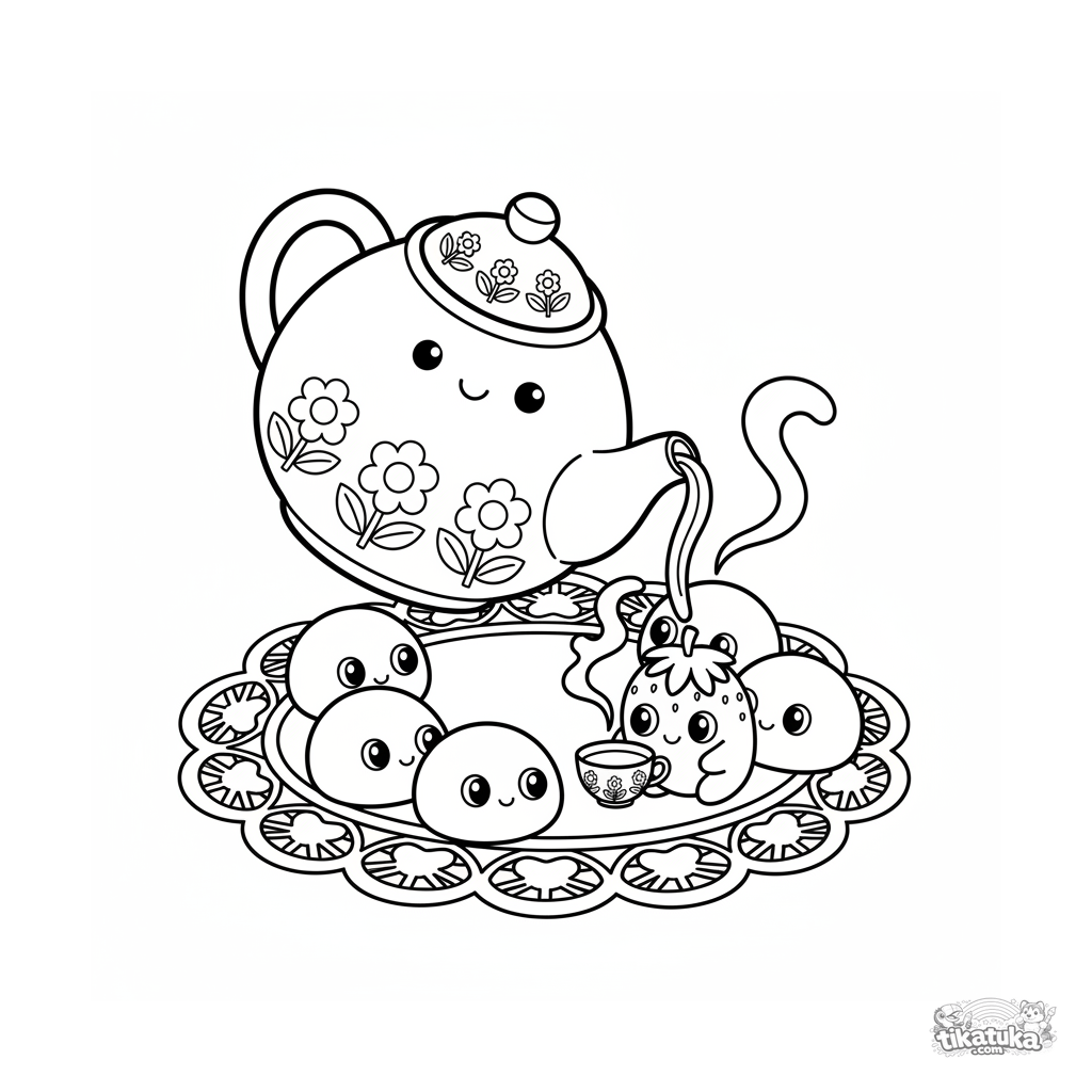Página para colorear simple para niños pequeños 2-3: una tetera sirve té a invitados mochi de fresa. Formas grandes y claras, pocos detalles.