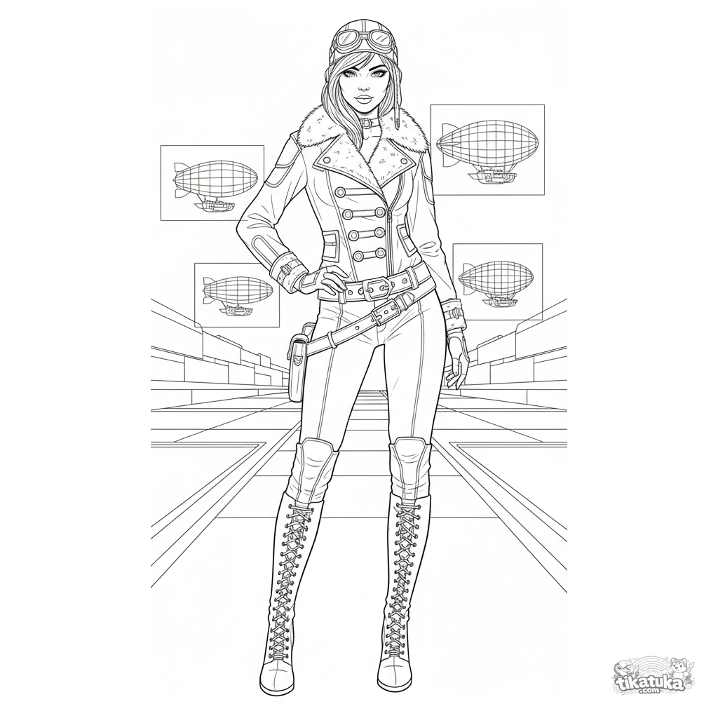 Página para colorear compleja para 10-12 años: modelo con chaqueta de aviador steampunk en pasarela futurista. Elementos mecánicos detallados, accesorios y fondo holográfico.