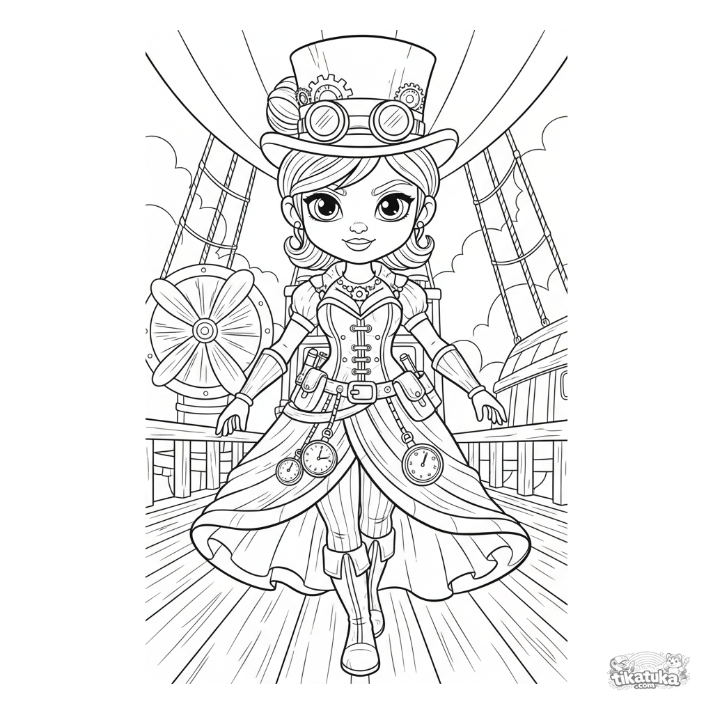 Página para colorear estilo cómic: una exploradora steampunk en un atuendo detallado con engranajes camina por la cubierta de una aeronave. Figura completa, fondo con hélices, para niñas 10-12.