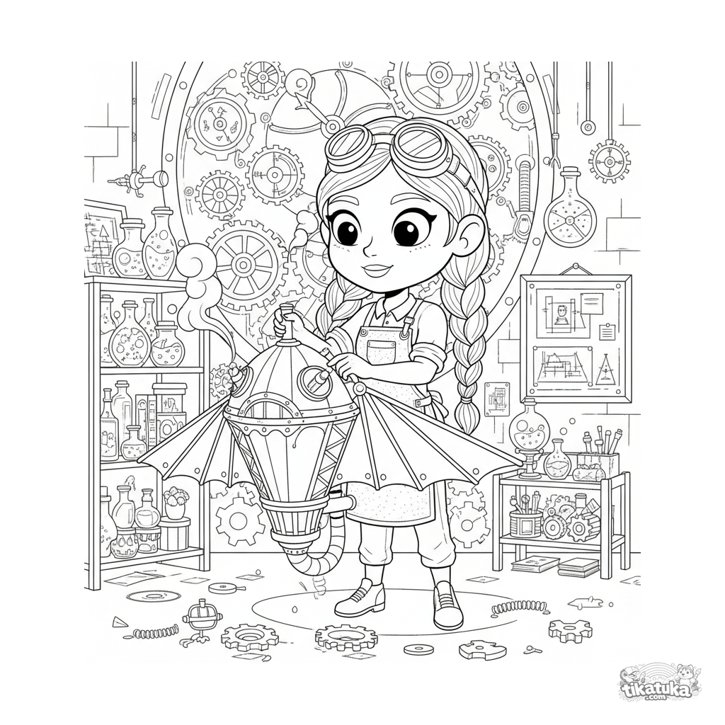 Página para colorear anime steampunk detallada: una chica inventora ajusta un dispositivo de vuelo en su taller de la torre del reloj. Escena intrincada con engranajes, planos y herramientas para 10-12 años.