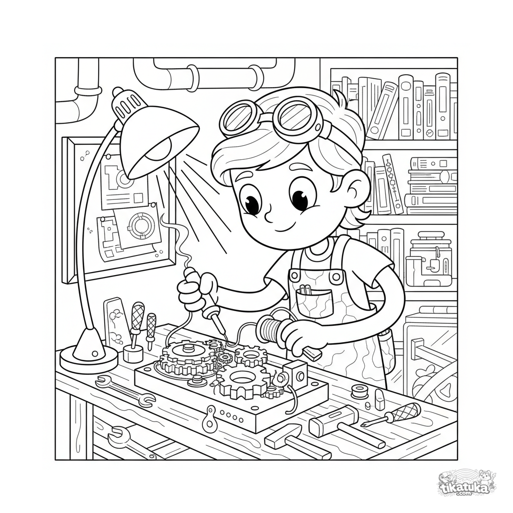 Página para colorear estilo steampunk: un inventor suelda un dispositivo mecánico en un laboratorio subterráneo. Detalles: planos, herramientas antiguas, engranajes.