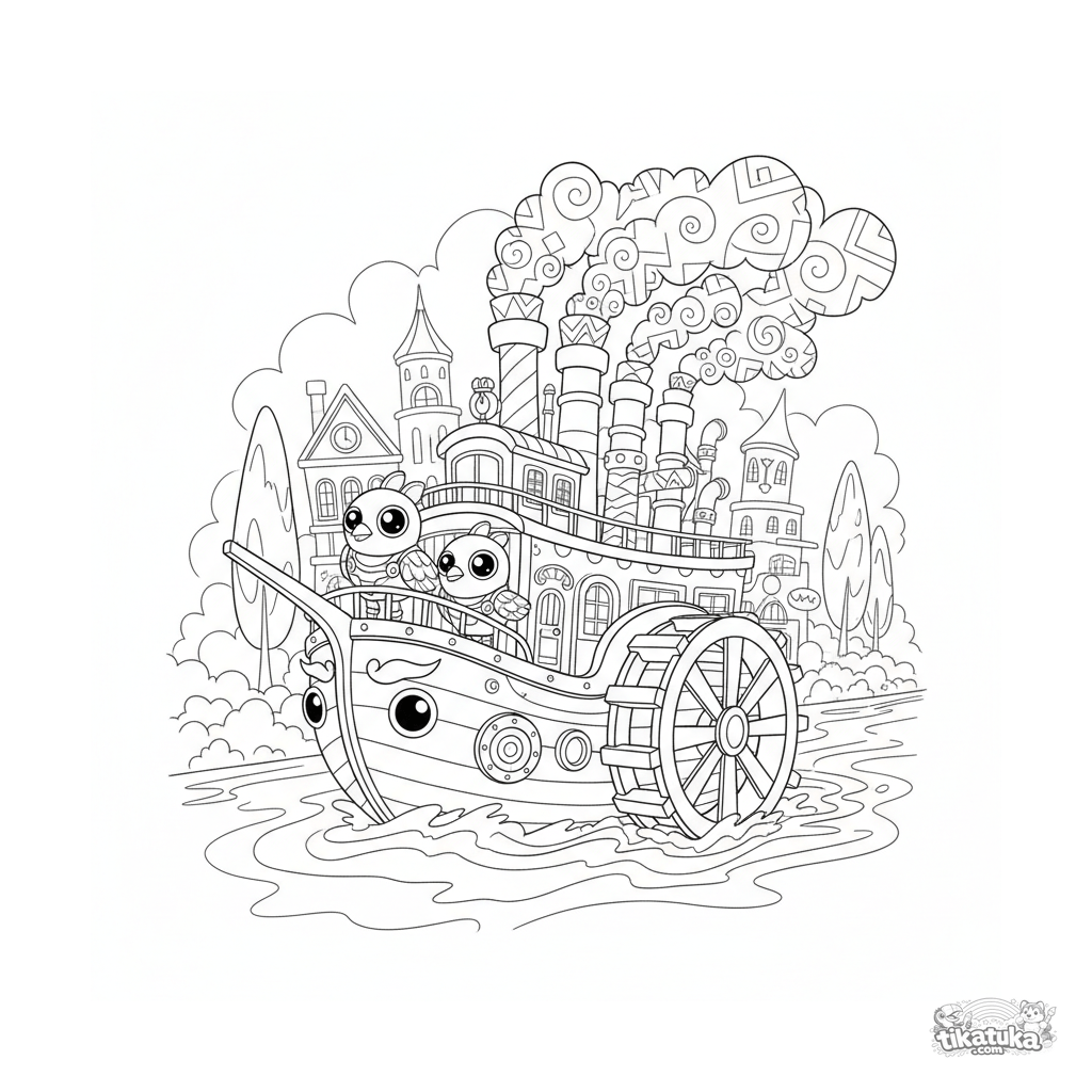 Página para colorear steampunk intrincada para niños mayores de 10 a 12 años: un vapor de ruedas mecánico detallado navega por un río.