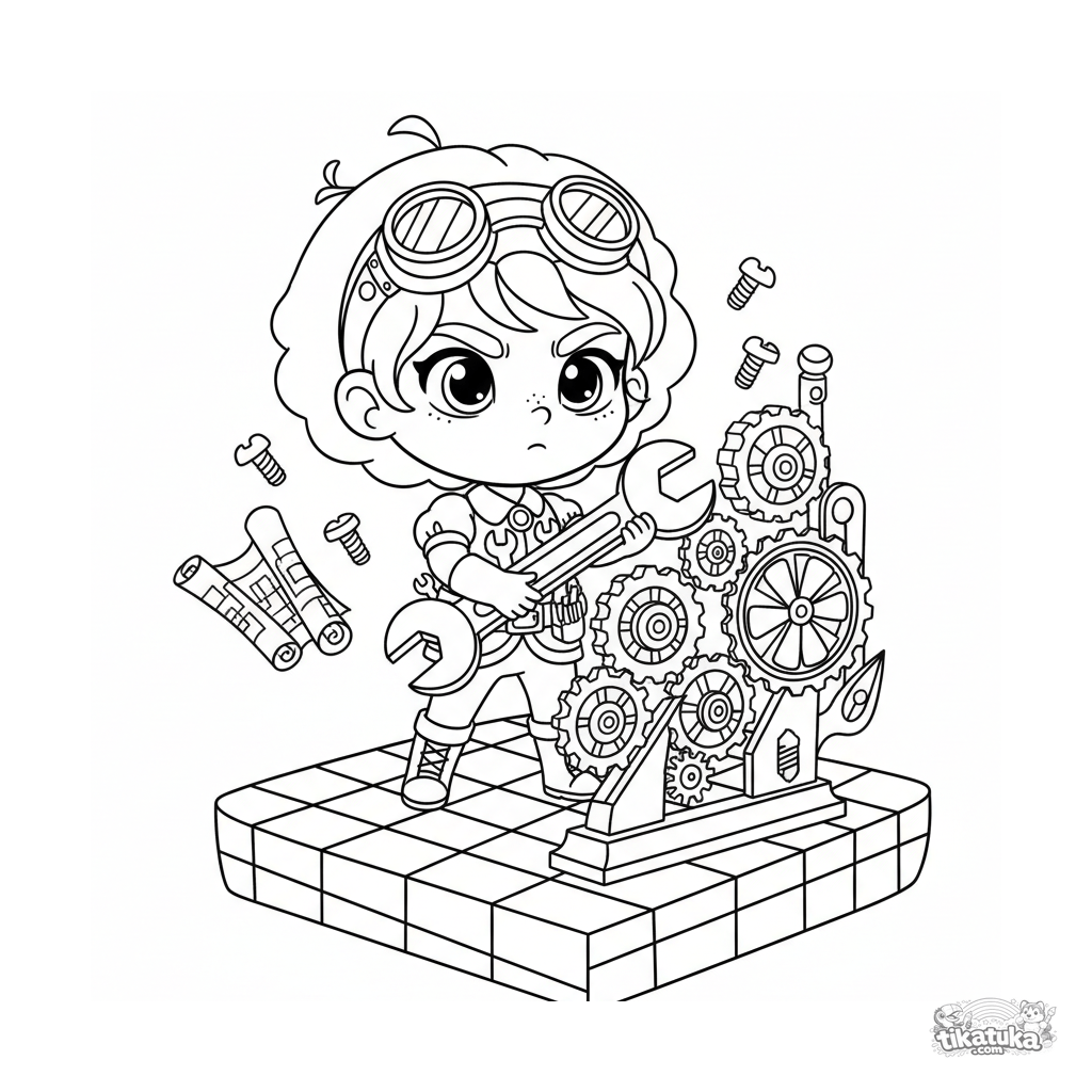 Página para colorear compleja para niños mayores 10-12: una princesa steampunk en un taller de nubes repara una máquina voladora.