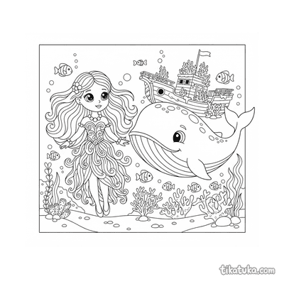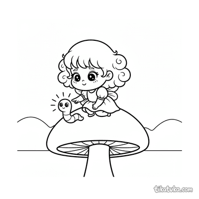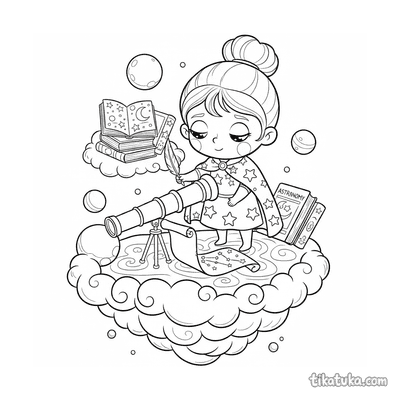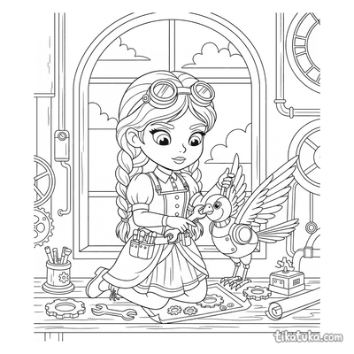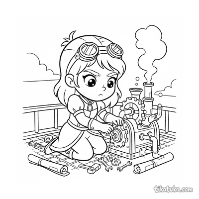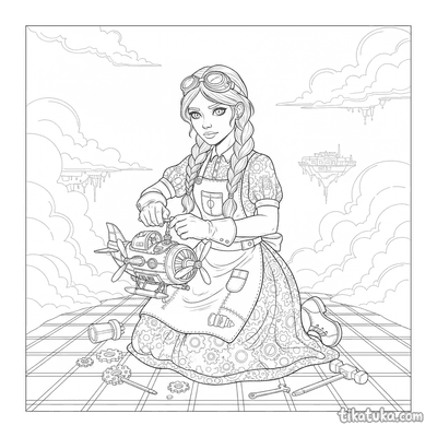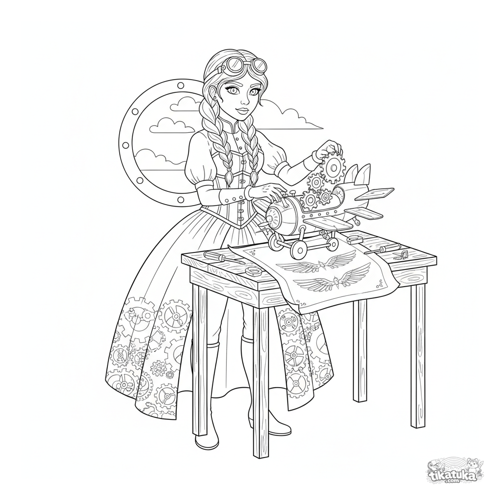 Página para colorear para mayores 10-12: una princesa steampunk ajustando una máquina voladora en su taller en las nubes. Planos detallados y herramientas.