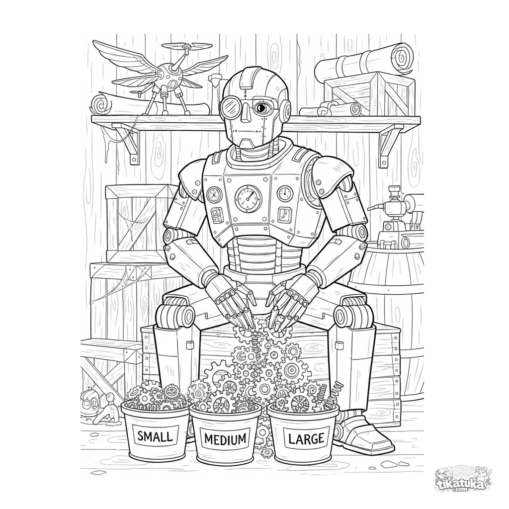 Página para colorear intrincada estilo steampunk para niños mayores de 10 a 12 años: un robot clasifica engranajes en un rincón de almacén.