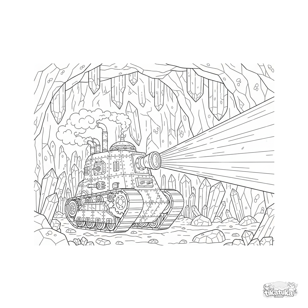 Página para colorear compleja para niños de 7 a 12 años. Un tanque steampunk detallado con tuberías y un reflector explora una vasta caverna con cristales brillantes.