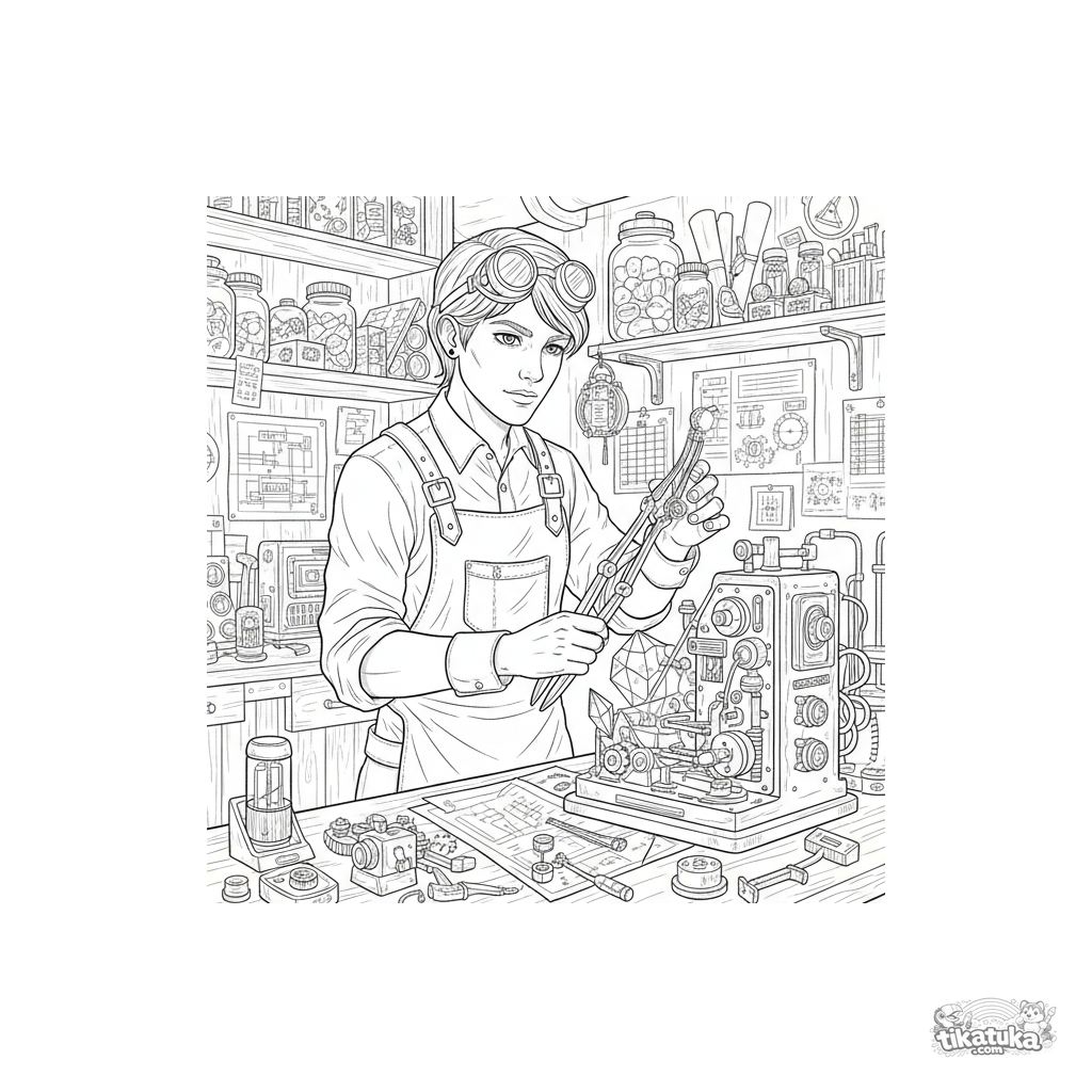 Página para colorear para niños 10-12: un inventor steampunk ensambla un dispositivo de cristal de datos en un taller del sótano. Muchos detalles: herramientas, planos, engranajes.