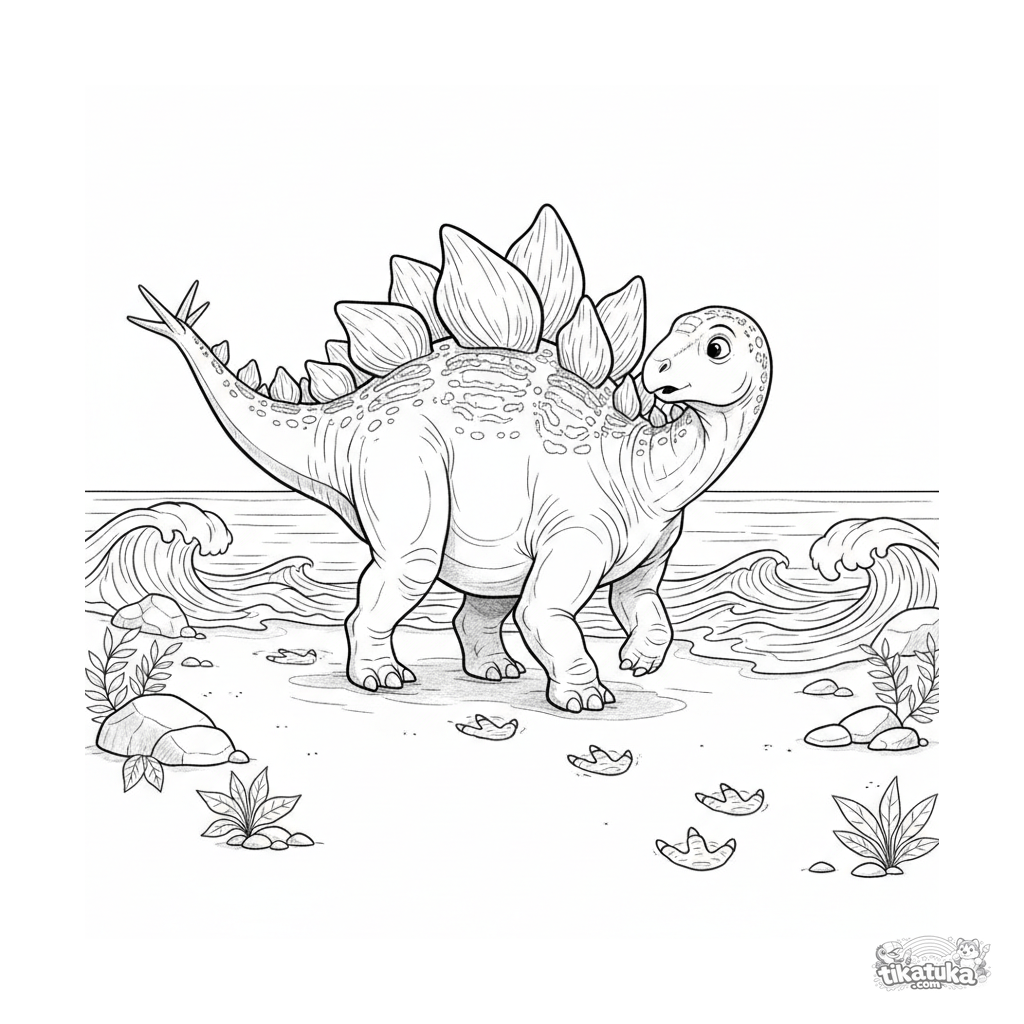 Página para colorear estilo acuarela detallada para niños 10-12: un estegosaurio dejando huellas en la arena mojada de un océano antiguo.