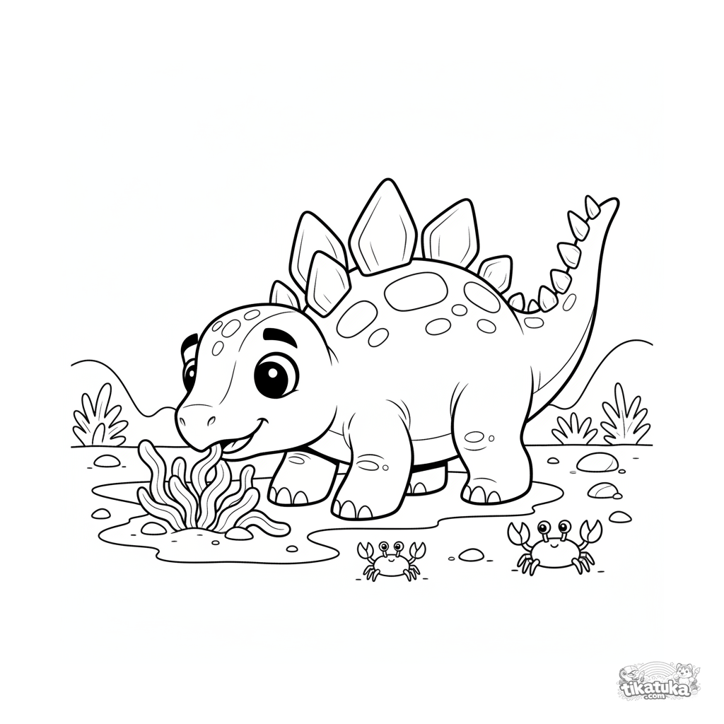 Página para colorear para 7-9 años: un joven estegosaurio alegre juega con un montón de algas en la orilla de arena de un océano antiguo. Cangrejos y piedras cerca.