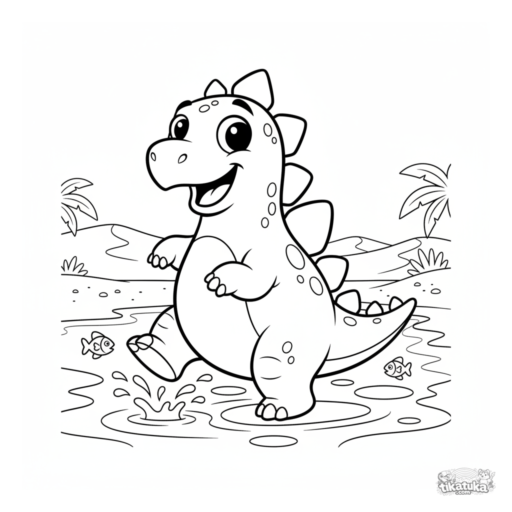 Página para colorear para 7-9 años: un estegosaurio alegre chapoteando en el agua poco profunda de un océano antiguo.