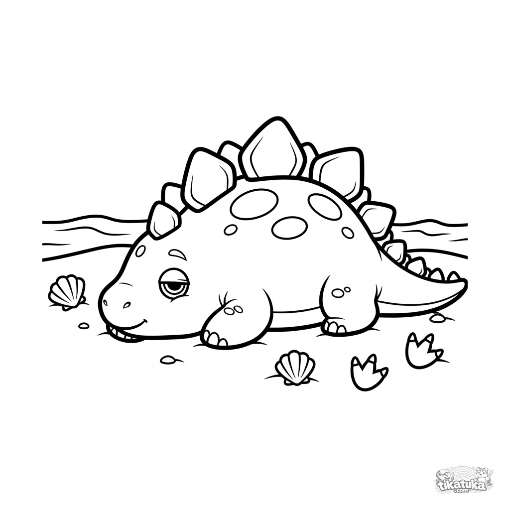Página simple para colorear para niños pequeños 2-3: un lindo estegosaurio descansa en una duna de arena junto al océano antiguo.