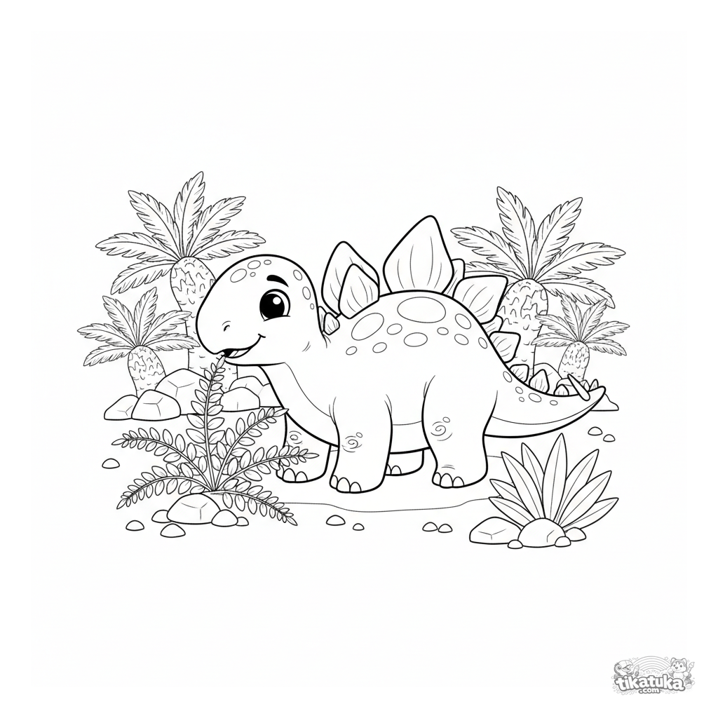Página para colorear para niños de 4-6 años: un lindo estegosaurio con placas en la espalda mordisquea helechos en un claro soleado. Escena simple y atractiva.