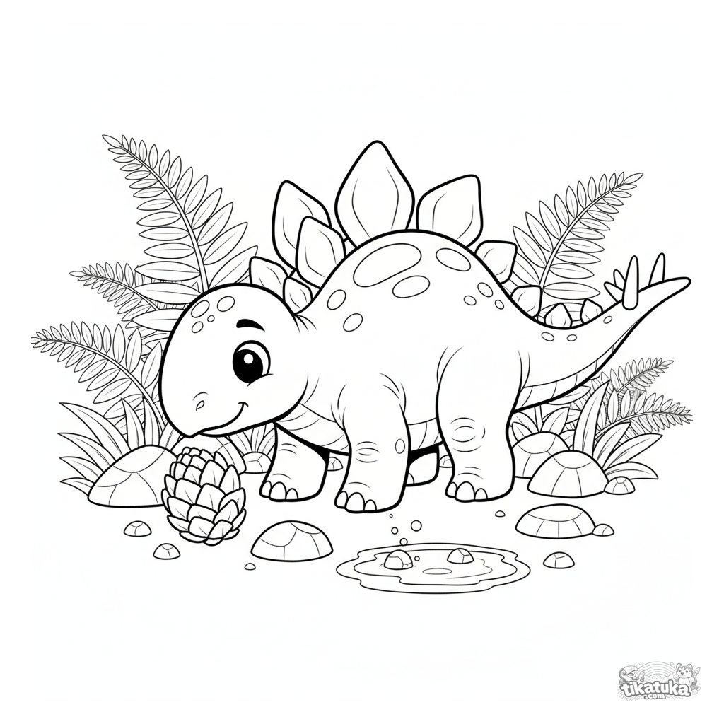 Página para colorear para niños de 4-6 años: un amigable estegosaurio con placas en la espalda en un bosque de helechos, olfateando una fruta.