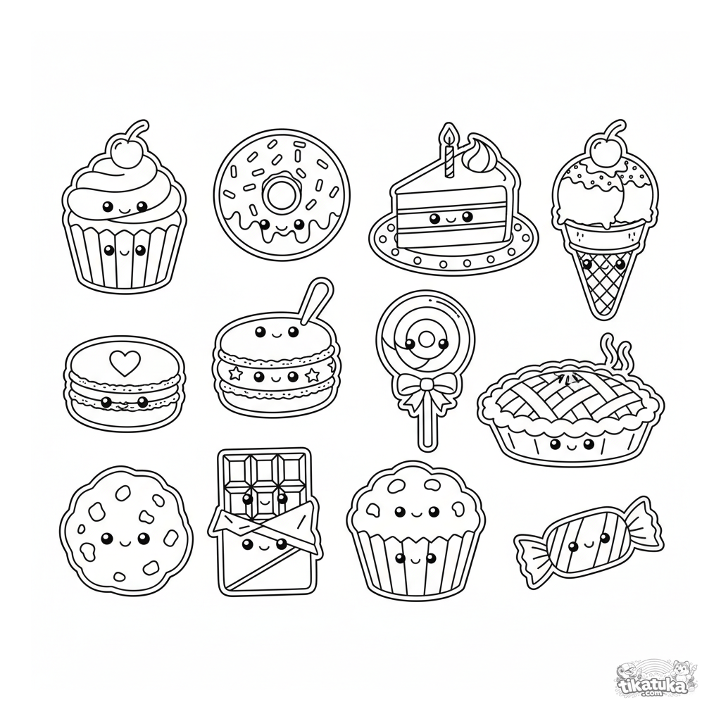 Página para colorear tipo hoja de pegatinas para niños de 7-12 años: 12 postres kawaii separados (cupcake, donut, helado, etc.) con caritas lindas, espaciados uniformemente en la página.