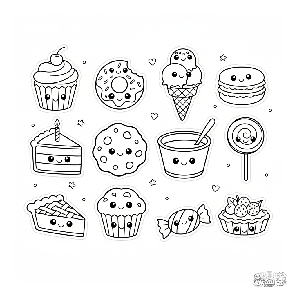 Página para colorear diseñada como una hoja de pegatinas con 12 postres kawaii lindos con caras felices. Para niños de 4 a 6 años.