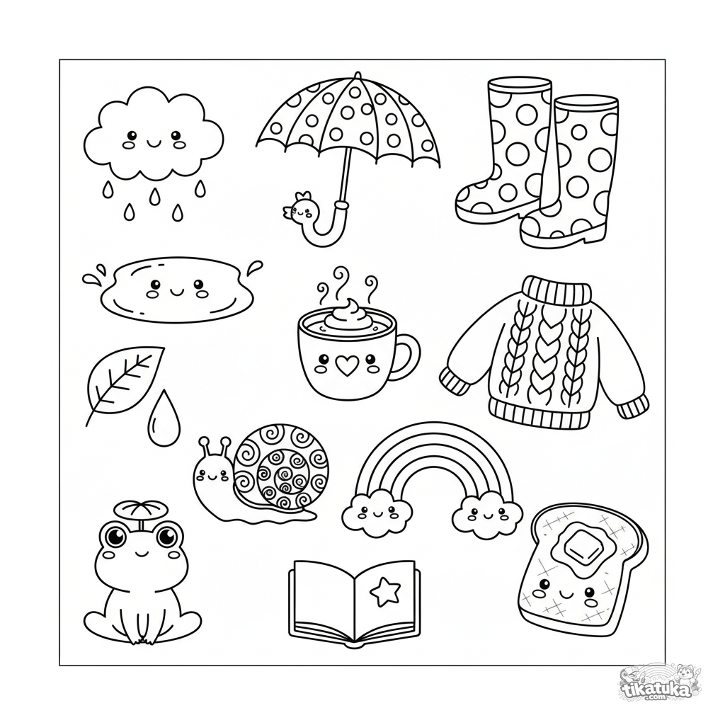 Hoja para colorear para niños mayores: 12 objetos kawaii separados con tema de día lluvioso (paraguas, botas, nube, taza, etc.) para colorear y recortar.