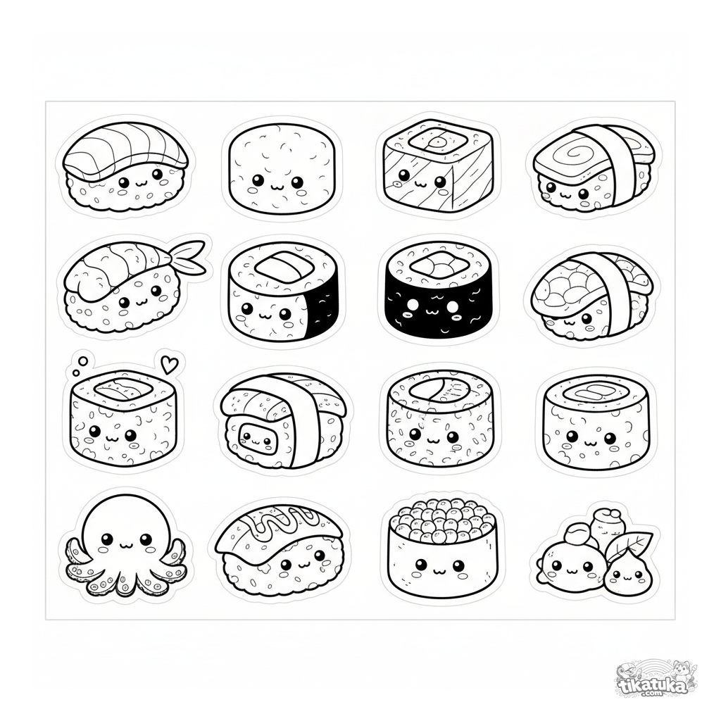 Página desafiante de hoja de pegatinas para colorear para niños de 7-12 años con 12 elementos de sushi kawaii. Cada item está separado para colorear y recortar.