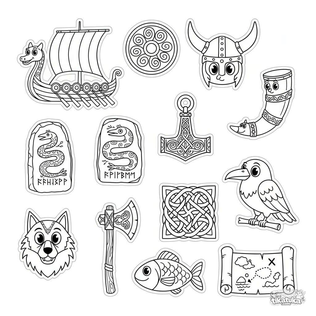 Hoja para colorear difícil con 12 objetos separados con temática vikinga para 7-12 años: barco largo, escudos, símbolos y amuletos, perfecto para recortar y colorear.