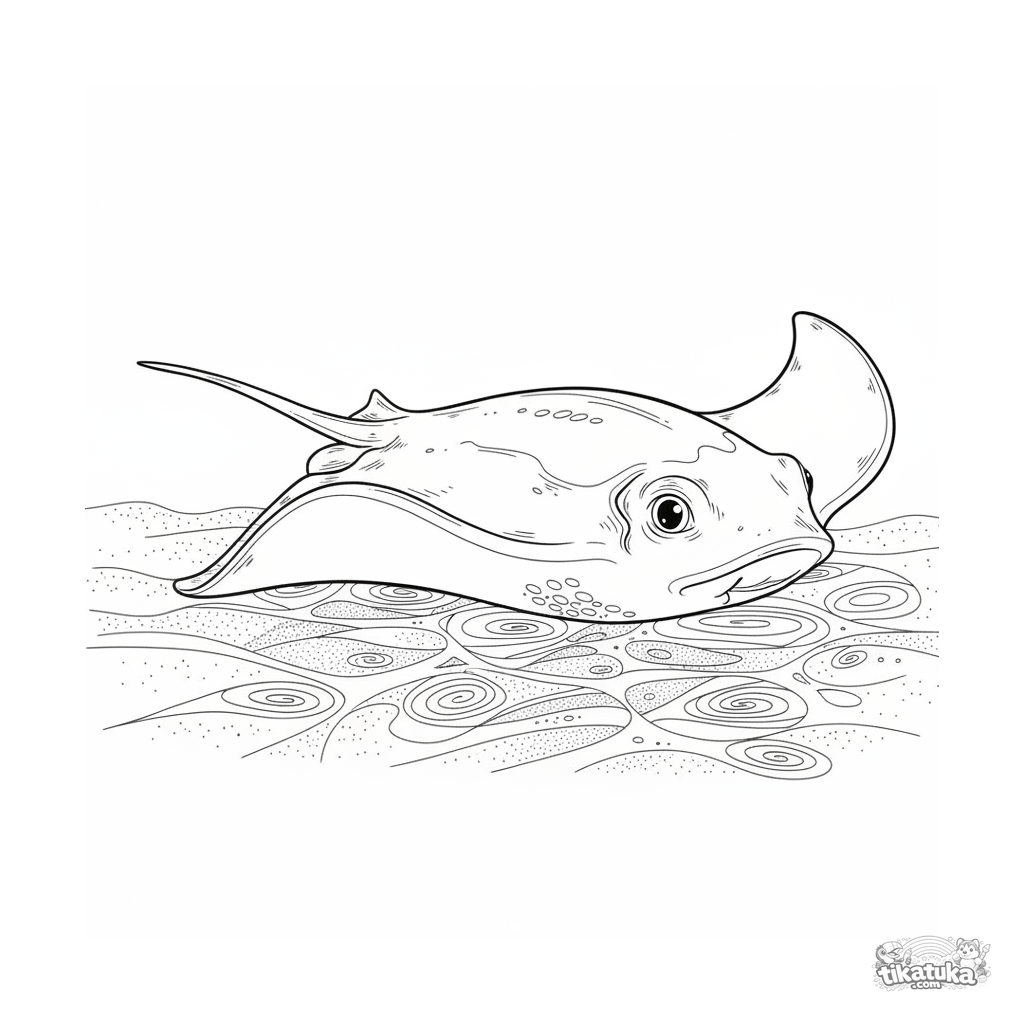 Página para colorear realista y detallada de una mantarraya deslizándose sobre la arena en patrones de luz solar en aguas poco profundas. Para niños mayores.