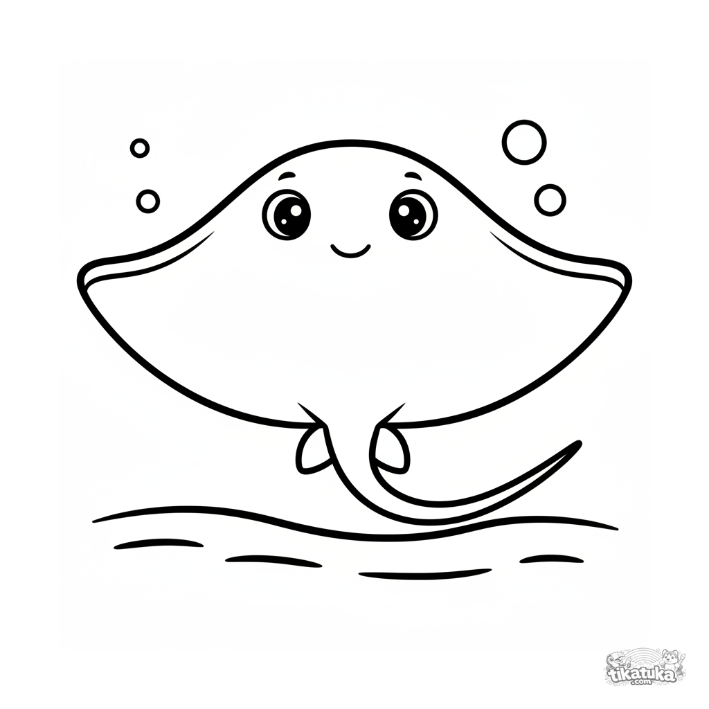 Página simple para colorear para niños pequeños: una mantarraya se desliza sobre la arena bajo rayos de sol. Formas grandes y claras. Para 2-3 años.