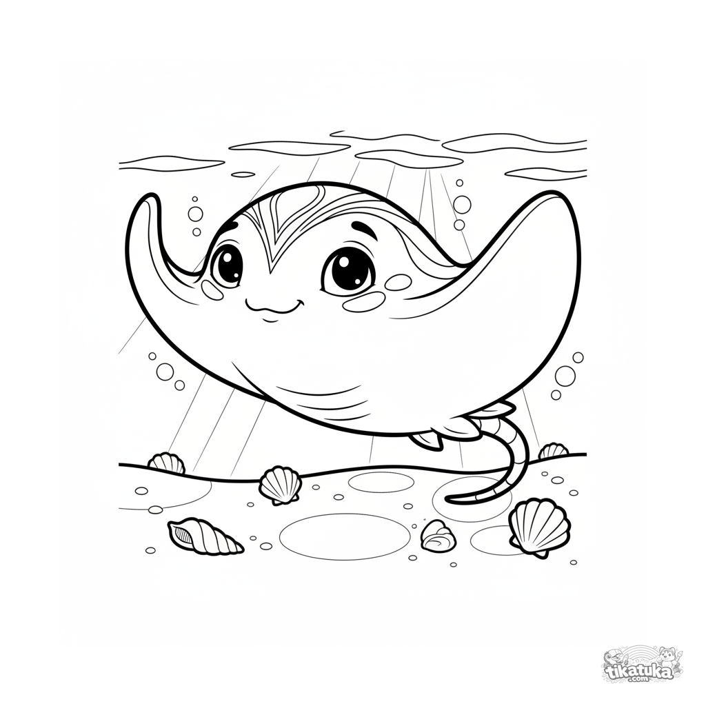Página para colorear para 7-9 años: una elegante mantarraya se desliza sobre la arena calentada por el sol en aguas poco profundas.
