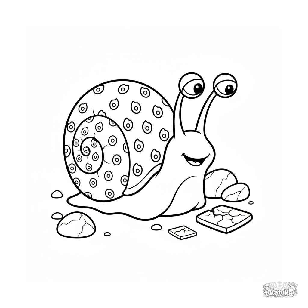 Página simple para colorear para niños pequeños 2-3: un caracol grande y amigable en la guarida de la Gorgona. Formas grandes y claras.