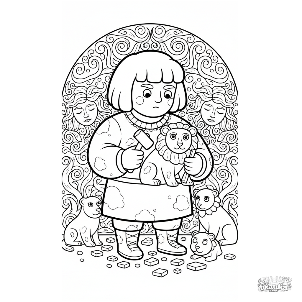 Página para colorear para niños 7-9: un escultor de piedra trabajando en el taller de la guarida de la Gorgona.