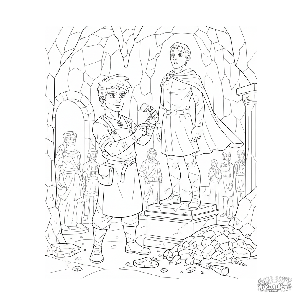 Página para colorear compleja para niños de 10-12 años: un escultor de piedra mítico trabajando en la guarida de la Gorgona. Muchos detalles en herramientas y estatuas.